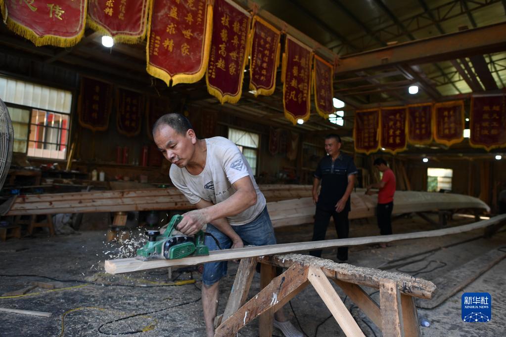 在福州市閩侯縣方莊村方和勇龍舟廠(chǎng),匠人在制造龍舟(6月12日攝)。