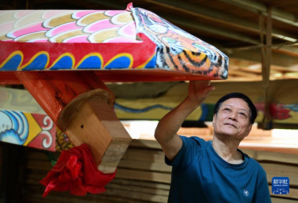 在福州市閩侯縣方莊村“龍舟世家”方忠雄龍舟廠(chǎng),福州市非物質(zhì)文化遺產(chǎn)“方莊龍舟制造技藝(閩侯縣)”傳承人方紹晃在查看傳統龍舟(5月23日攝)。