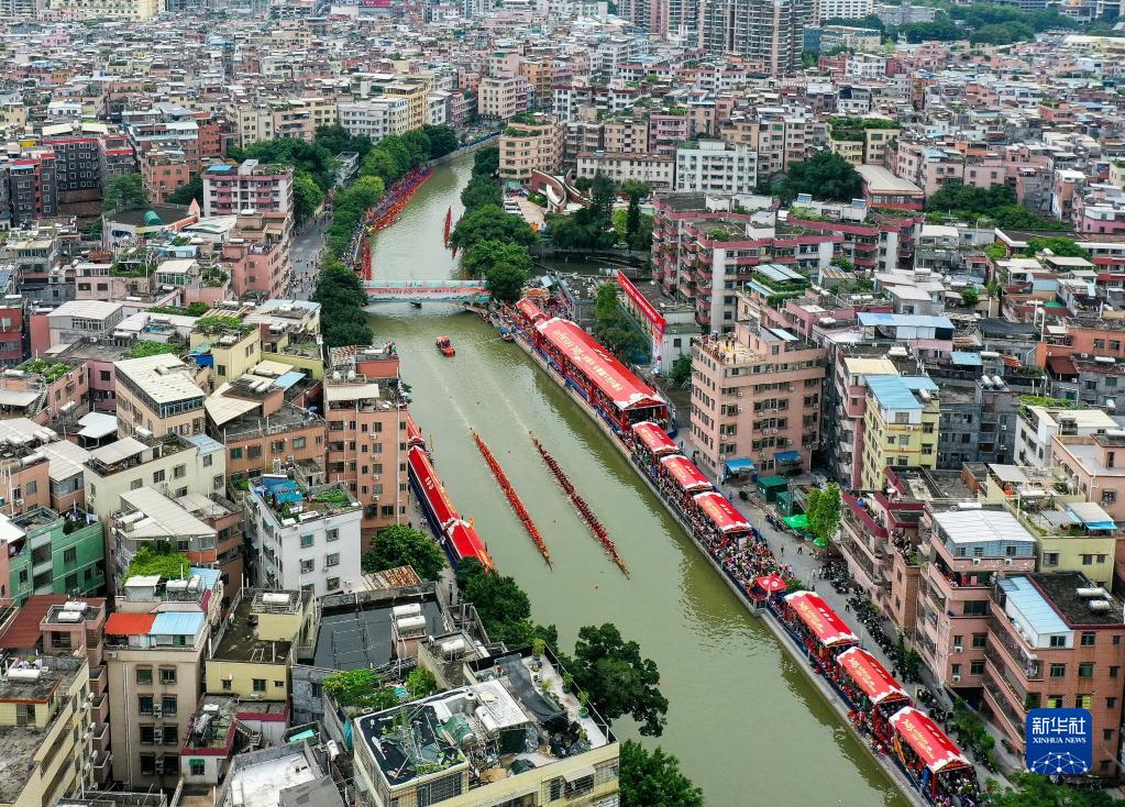 自農歷四月初八“起龍舟”開(kāi)始,廣州地區就開(kāi)啟了劃龍舟、迎端午的年度大戲。6月15日,車(chē)陂村12條龍船在車(chē)陂涌進(jìn)行龍舟競渡。