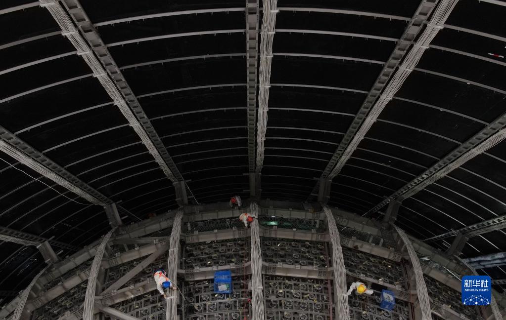 6月14日,工作人員在江門(mén)中微子實(shí)驗探測器的不銹鋼結構上進(jìn)行安裝作業(yè)(無(wú)人機照片)。