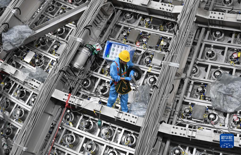 6月15日,工作人員在江門(mén)中微子實(shí)驗探測器的不銹鋼結構上進(jìn)行安裝作業(yè)。