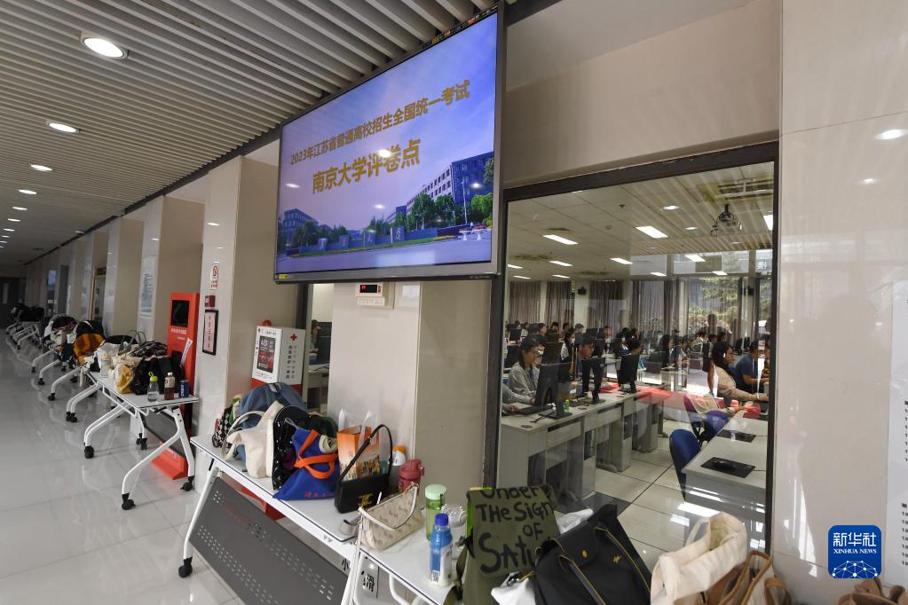 6月15日,閱卷教師在南京大學(xué)閱卷點(diǎn)認真評卷,隨身物品放在教室外。