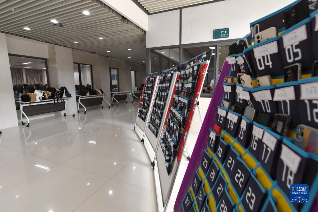 6月15日,閱卷教師在南京大學(xué)閱卷點(diǎn)認真評卷,場(chǎng)外是閱卷教師手機集中保管袋。