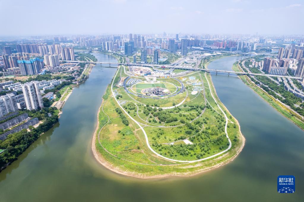 這是6月7日在長(cháng)沙市開(kāi)福區拍攝的馬欄山鴨嘴濕地公園(無(wú)人機照片)。
