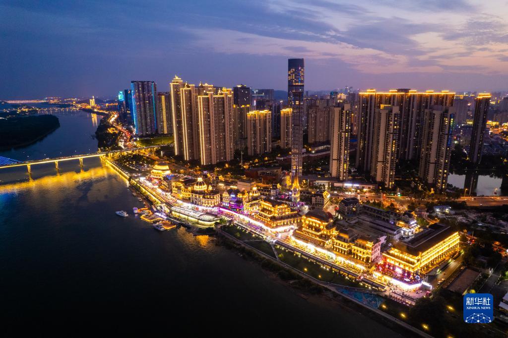這是6月9日在長(cháng)沙市岳麓區拍攝的漁人碼頭夜市(無(wú)人機照片)。