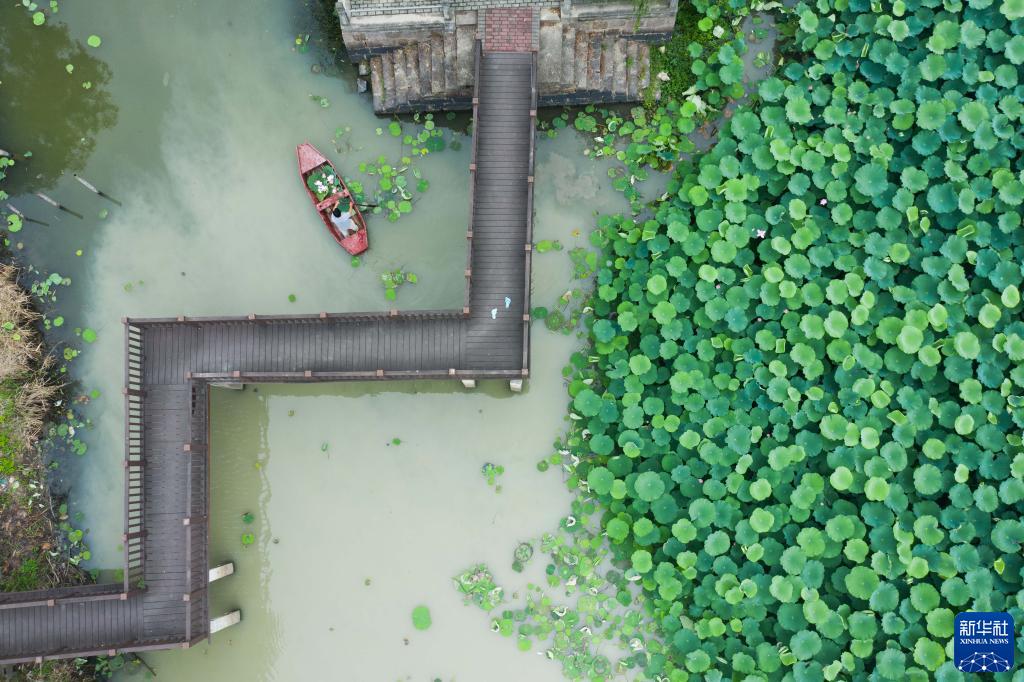 6月16日,空中俯瞰東林鎮泉心村的荷花塘。村民劃著(zhù)船采收荷花、荷葉,作為鄉村旅游特色產(chǎn)品(無(wú)人機照片)。