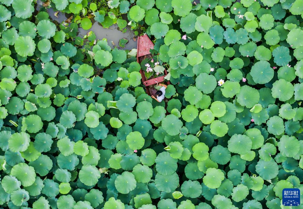 6月16日,空中俯瞰東林鎮泉心村村民劃著(zhù)船采收荷花、荷葉,作為鄉村旅游特色產(chǎn)品(無(wú)人機照片)。