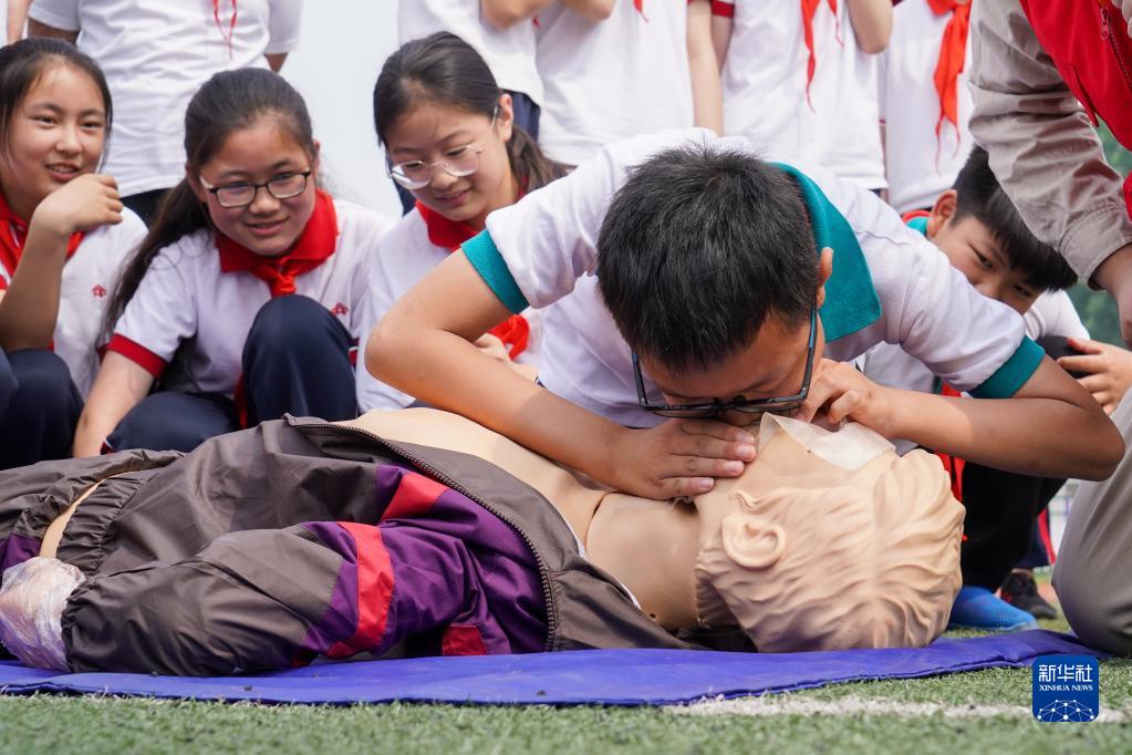 6月16日,一名小學(xué)生利用仿真人學(xué)習人工呼吸。
