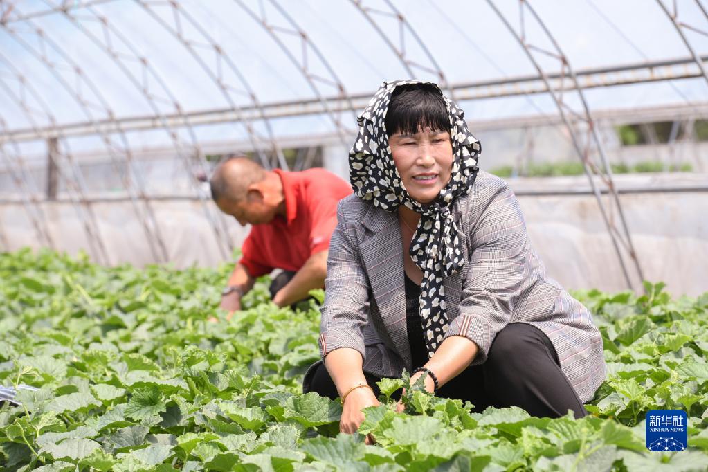 在西安村有機蔬菜水果采摘大棚,王英俠(右)和村民一起為農作物實(shí)施田間管理作業(yè)(6月15日攝)。