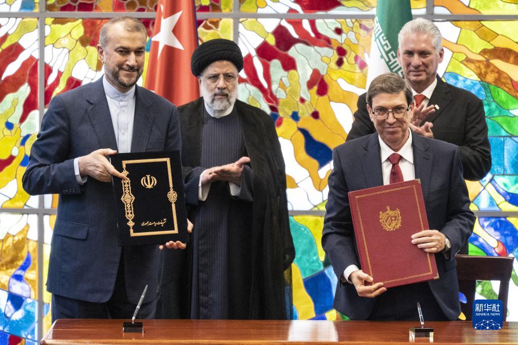 6月15日,在古巴首都哈瓦那革命宮,在古巴國家主席迪亞斯-卡內爾(后右)和伊朗總統萊希(后左)的見(jiàn)證下,古巴外交部長(cháng)布魯諾·羅德里格斯(前右)和伊朗外交部長(cháng)阿卜杜拉希揚(前左)簽署雙邊合作協(xié)議。