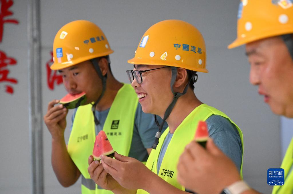 6月16日,在天津市濱海新區耀華中學(xué)濱海學(xué)校項目工地,一線(xiàn)工人在吃公司送來(lái)的西瓜消暑。