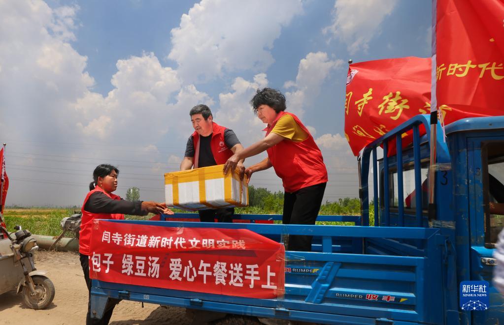 6月16日,山東省聊城市東昌府區閆寺街道辦事處的工作人員把愛(ài)心午餐送到麥收現場(chǎng)。