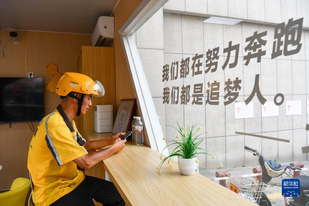 6月16日,在山東鄒平市黛溪街道天興城商圈內的“暖蜂驛站”里,外賣(mài)員在送餐空閑期休憩納涼。