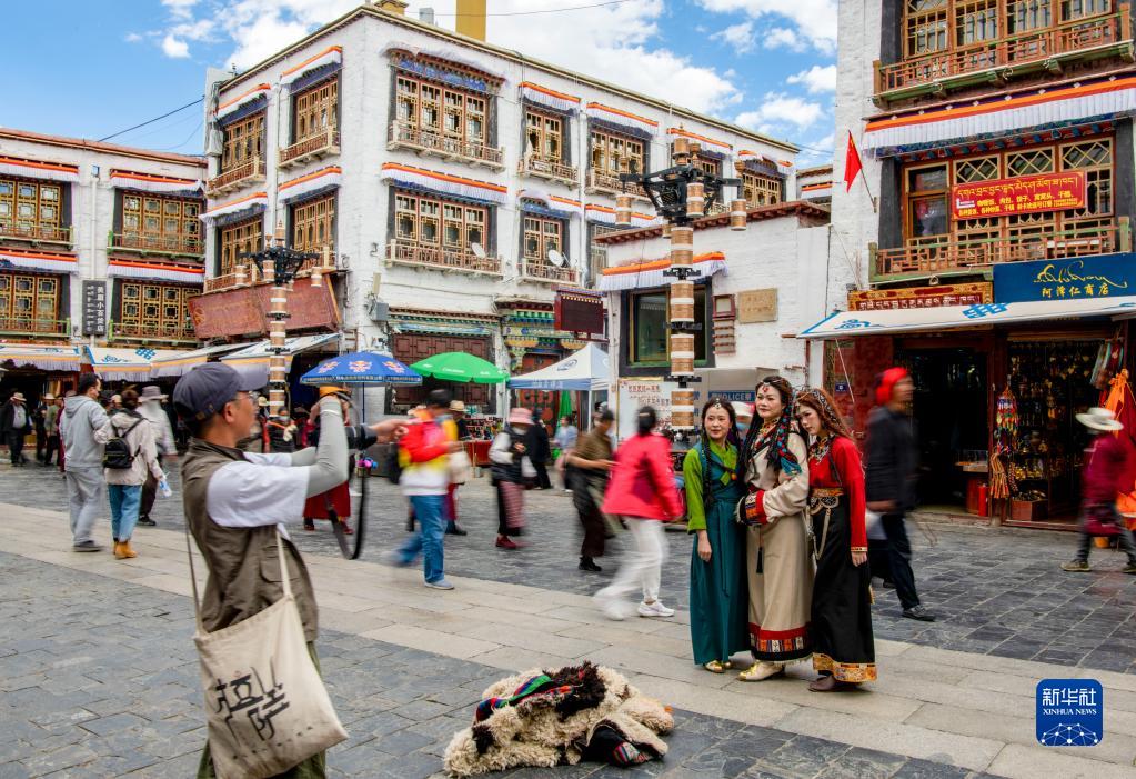 游客身著(zhù)藏裝在八廓街拍照留念(6月13日攝)。