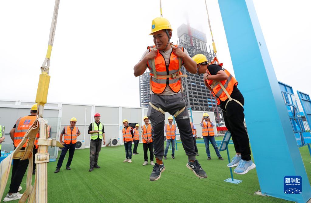 6月16日,工人在實(shí)訓場(chǎng)內體驗佩戴安全帶懸空下墜的項目。