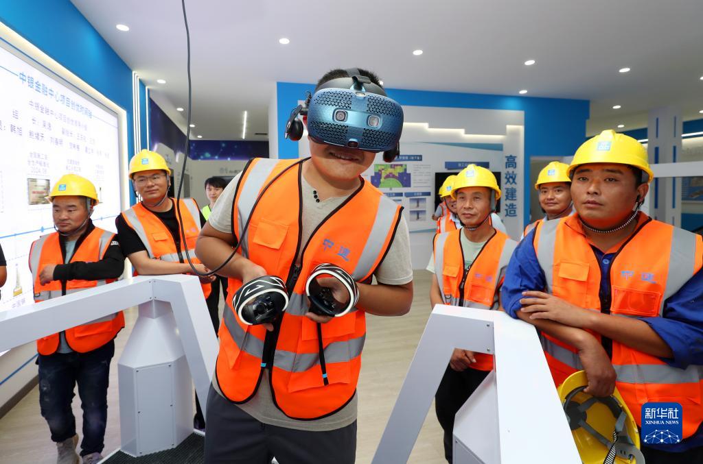 6月16日,工人佩戴VR眼鏡進(jìn)行工地安全事故實(shí)景體驗。