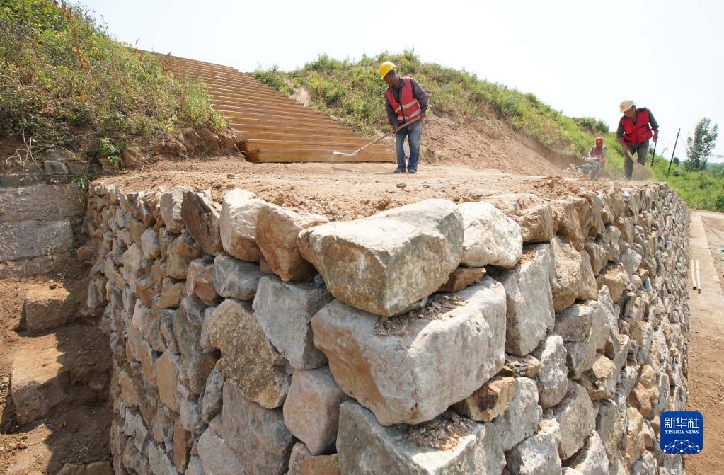 6月16日,工人在山海關(guān)長(cháng)城51號墻臺馬道修繕工地施工。