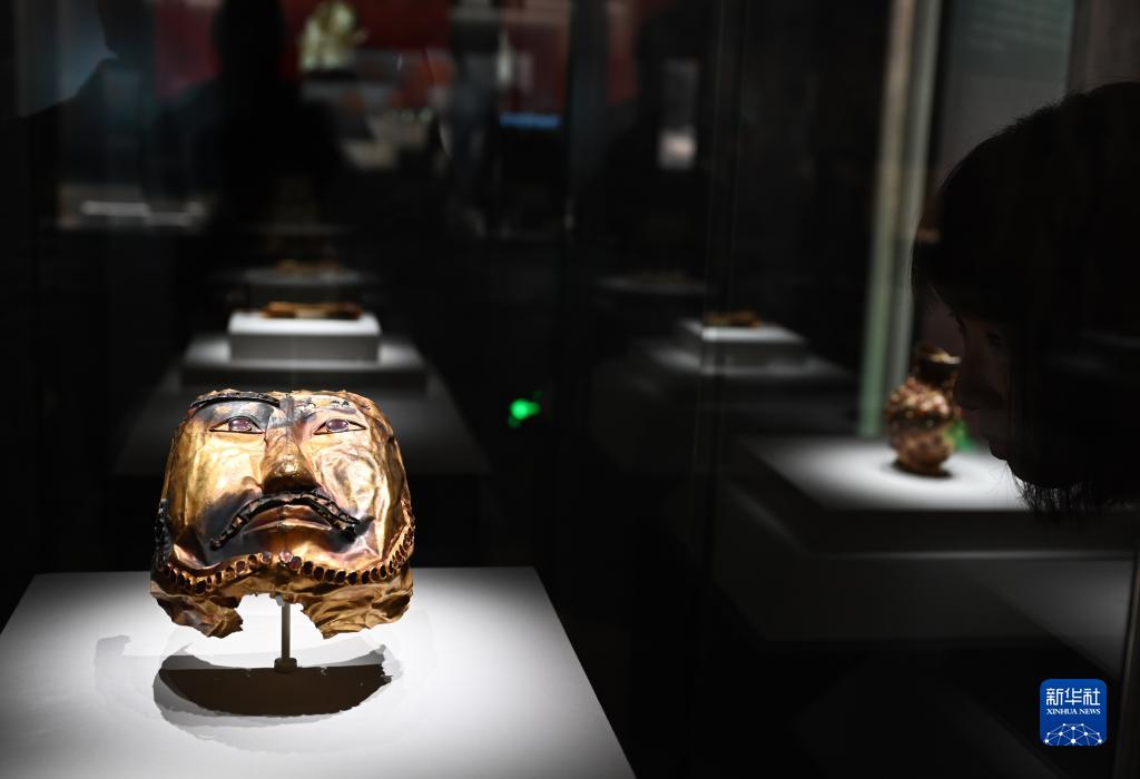 這是展出的鑲嵌紅寶石金面具(6月16日攝)。