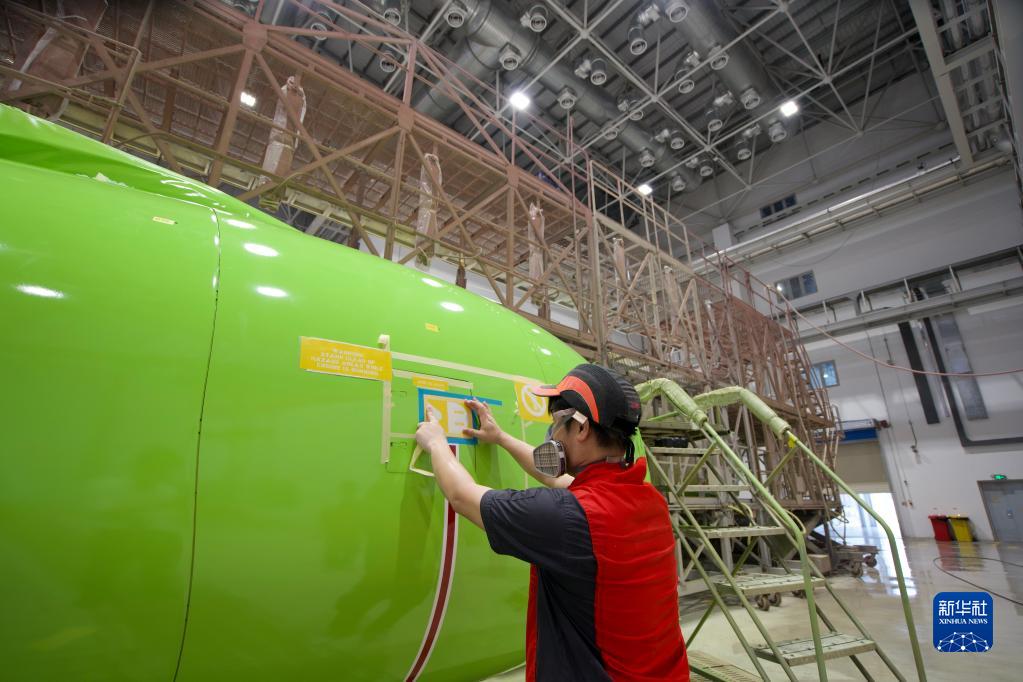 6月15日,海航斯提斯噴漆作業(yè)員在恢復發(fā)動(dòng)機外部標牌。