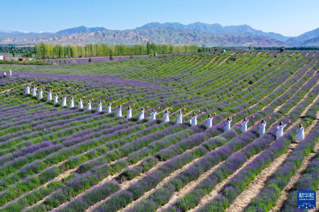 在位于新疆霍城縣蘆草溝鎮四宮村的解憂(yōu)公主薰衣草農場(chǎng),薰衣草形象大使在薰衣草花田里歡迎遠方來(lái)客(6月16日攝,無(wú)人機照片)。
