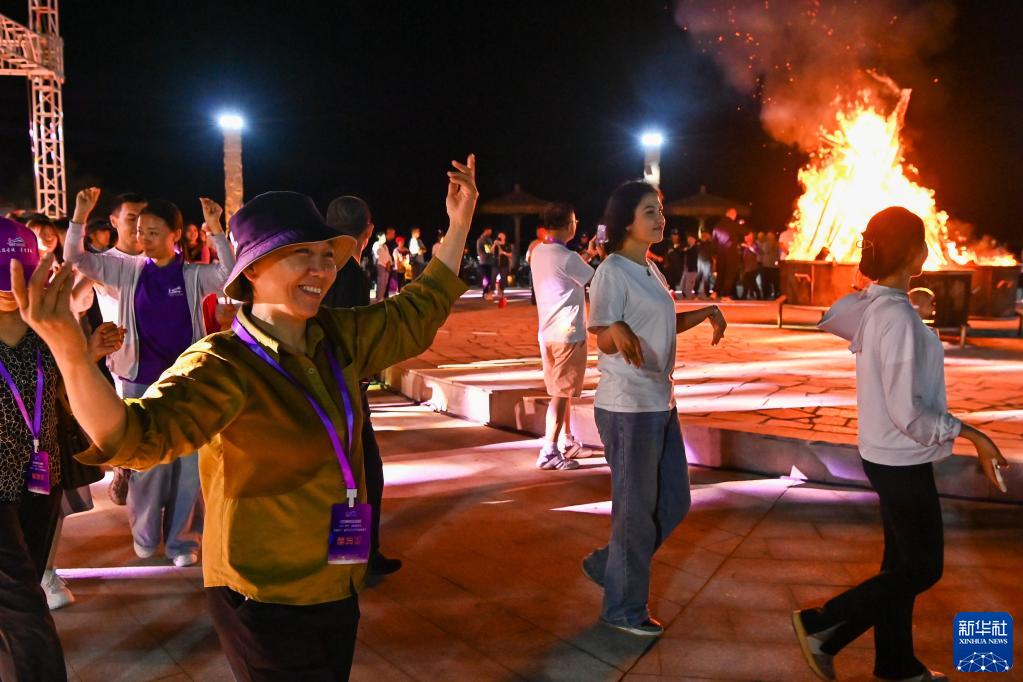 在新疆霍城縣圖開(kāi)沙漠,游客和當地居民一起圍著(zhù)篝火跳舞(6月17日攝)。