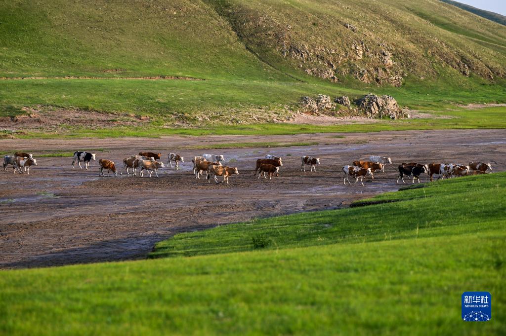 6月16日,在阿魯科爾沁旗巴彥溫都爾蘇木塔林花游牧區,牲畜走過(guò)河灘地。