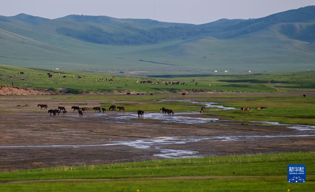 6月16日,在阿魯科爾沁旗巴彥溫都爾蘇木塔林花游牧區,牲畜在河灘地覓食。