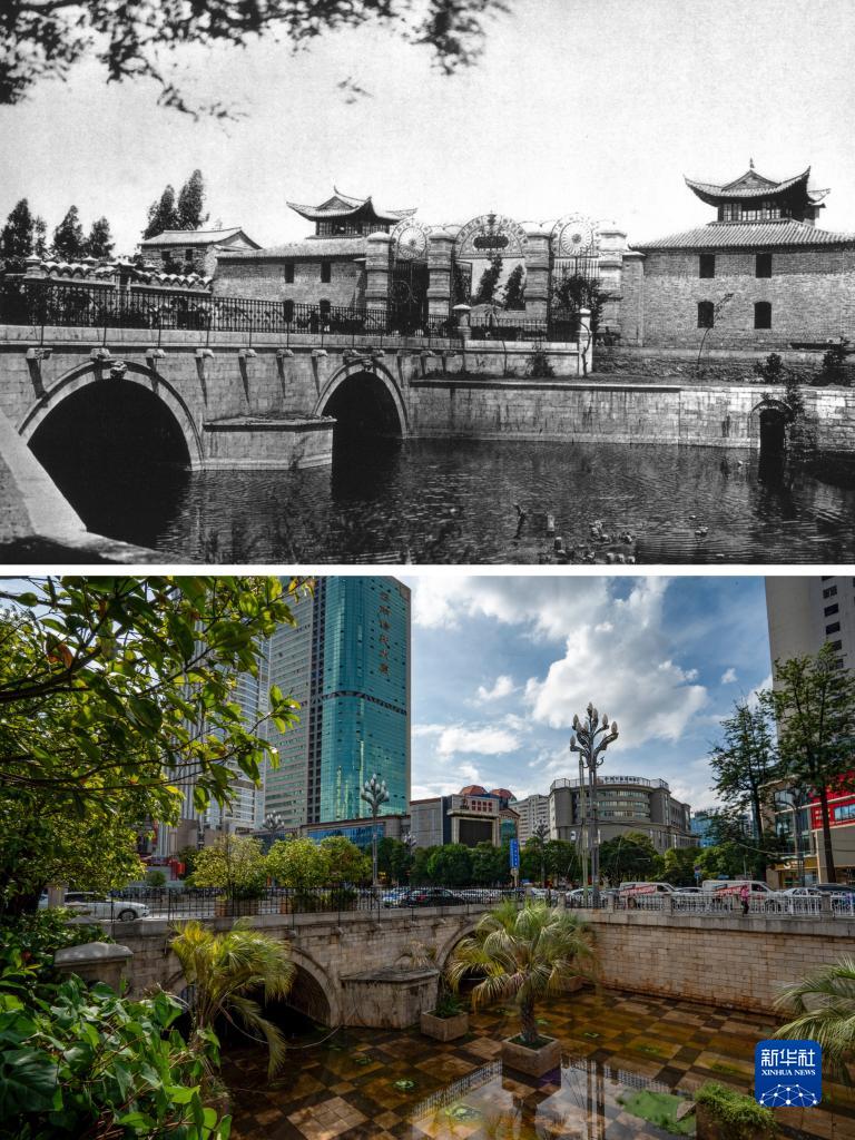 下圖為如今的昆明護國橋及周邊景色(6月15日攝)。護國橋曾一度因修路被填埋,2001年重見(jiàn)天日后重新修繕。新華社記者江文耀攝