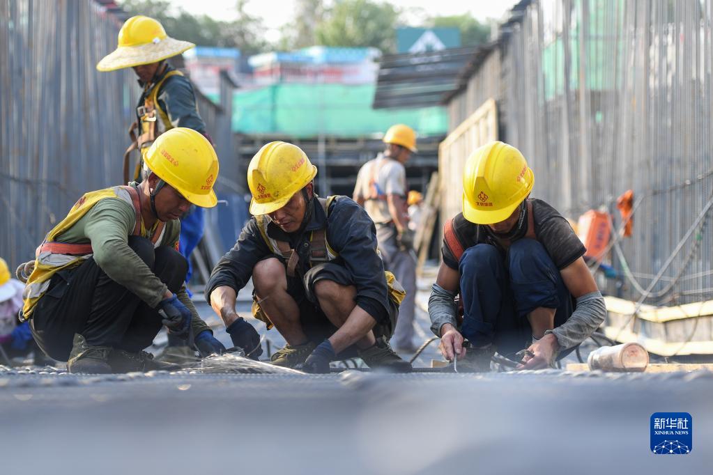 6月16日,在北京城市副中心站綜合交通樞紐項目02標段北京城建施工現場(chǎng),工人在捆扎鋼筋。為了應對高溫天氣,工地已調整作息時(shí)間,施工時(shí)間避開(kāi)了中午高溫時(shí)段。