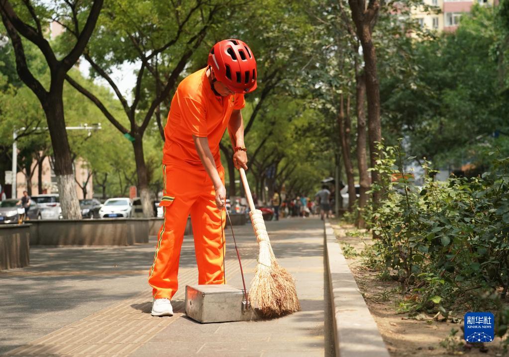6月17日,北京綠鑫城市環(huán)境管理有限公司工作人員賈國壽在北京市海淀區中關(guān)村街道科學(xué)院南路清掃人行道。公司為賈國壽和同事們提供了綠豆湯、藿香正氣水、清涼油等防暑降溫用品。