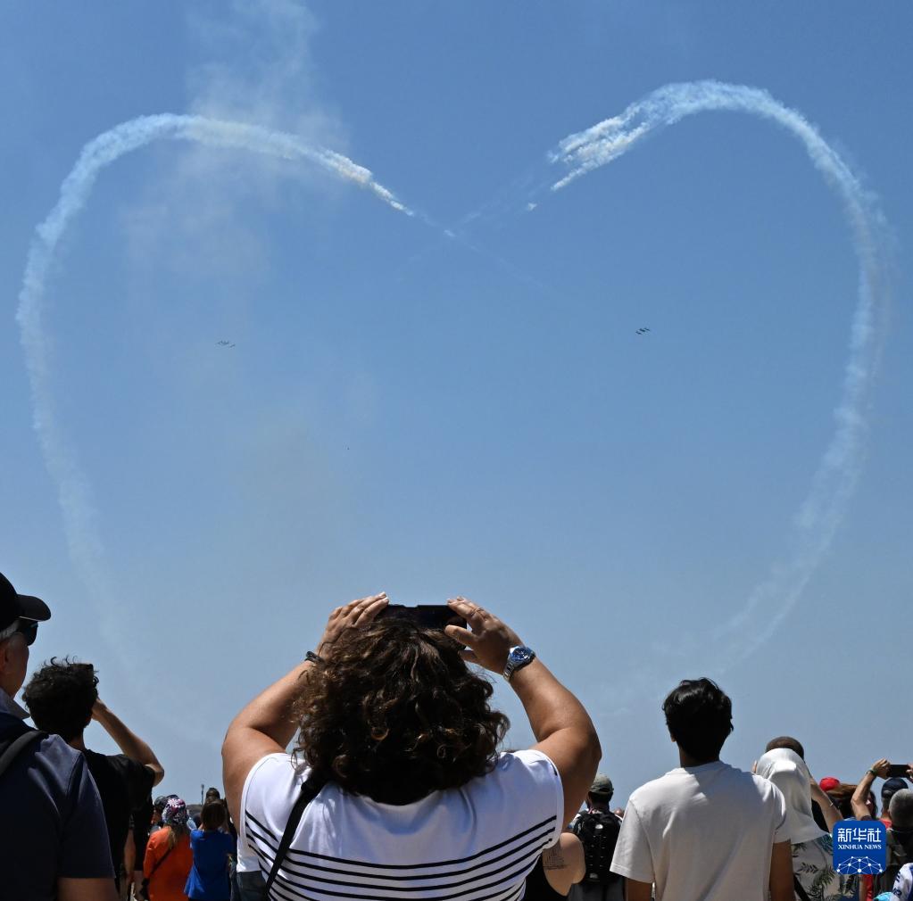 6月16日,人們在意大利普拉蒂卡迪馬雷空軍基地觀(guān)看意大利“三色箭”飛行表演隊在航空展媒體預展上的飛行表演。