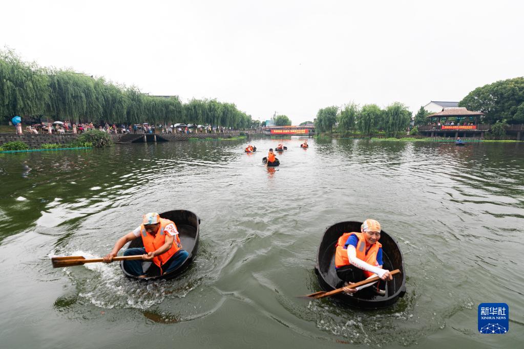 當日,浙江省湖州市吳興區東林鎮舉辦“慶端午 劃菱桶”趣味系列活動(dòng),來(lái)自各村的30多名選手一人一桶在泉益村的河塘里競相追逐,熱鬧非凡?;顒?dòng)現場(chǎng)還設有射五毒、做香囊、包粽子、做艾草花束等活動(dòng),讓百姓和游客在觀(guān)賞精彩比賽的同時(shí)了解特色端午習俗。