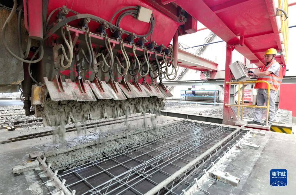 6月17日,工人在秦皇島市撫寧區一家裝配式建筑企業(yè)的生產(chǎn)車(chē)間操作機械設備澆筑預制鋼筋混凝土墻體。