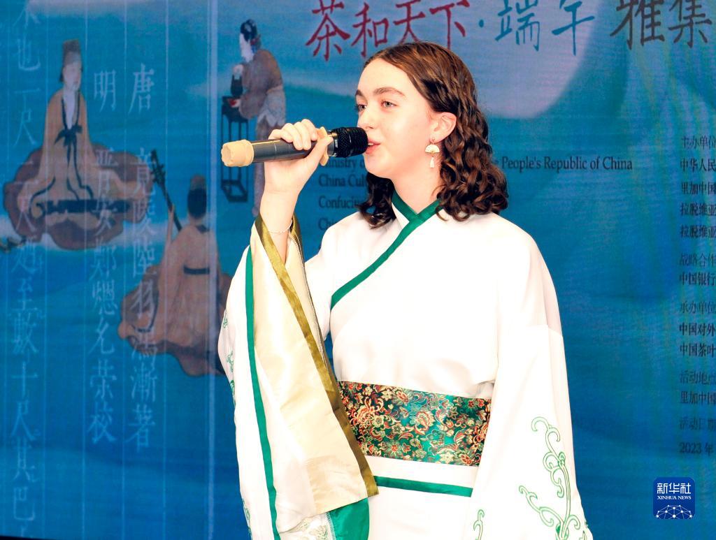 6月15日,一名拉脫維亞學(xué)生在里加舉行的“茶和天下·端午雅集”活動(dòng)上演唱中文歌曲。