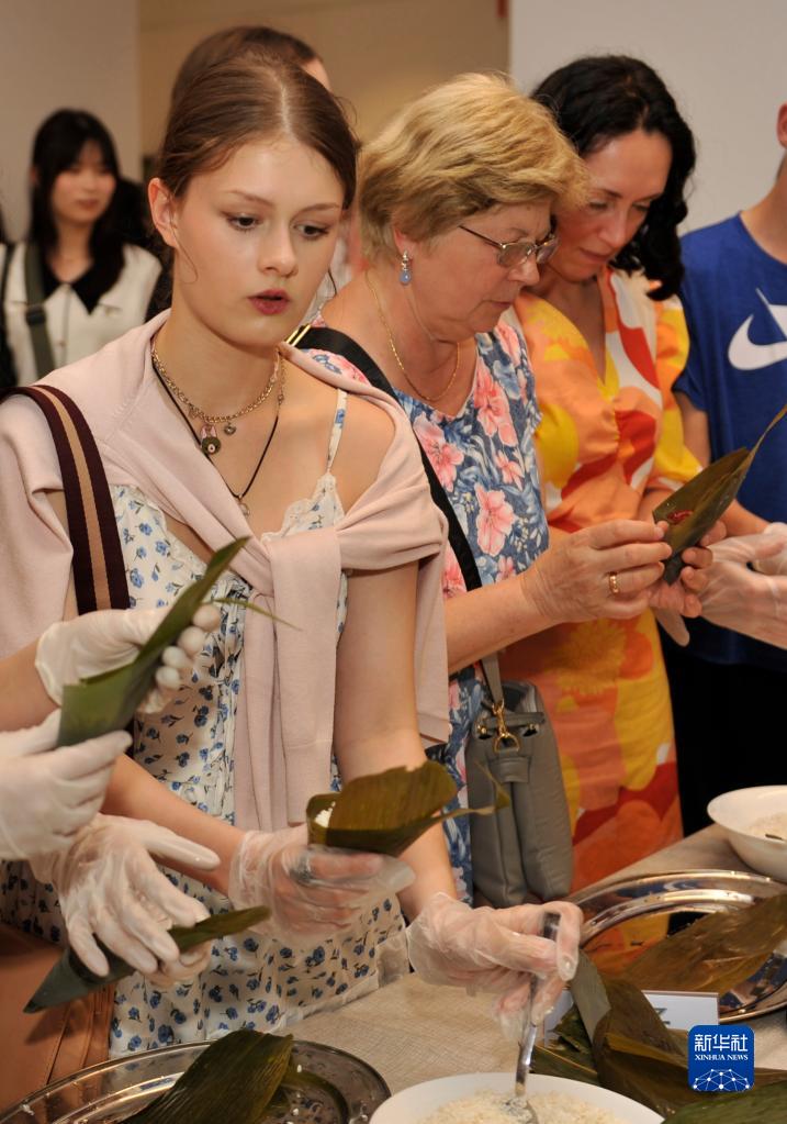 6月15日,人們在拉脫維亞里加舉行的“茶和天下·端午雅集”活動(dòng)上學(xué)包粽子。