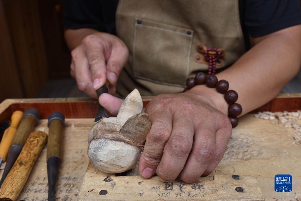 6月17日,一名手工藝人在鎮遠古城一家木雕店雕刻工藝品。