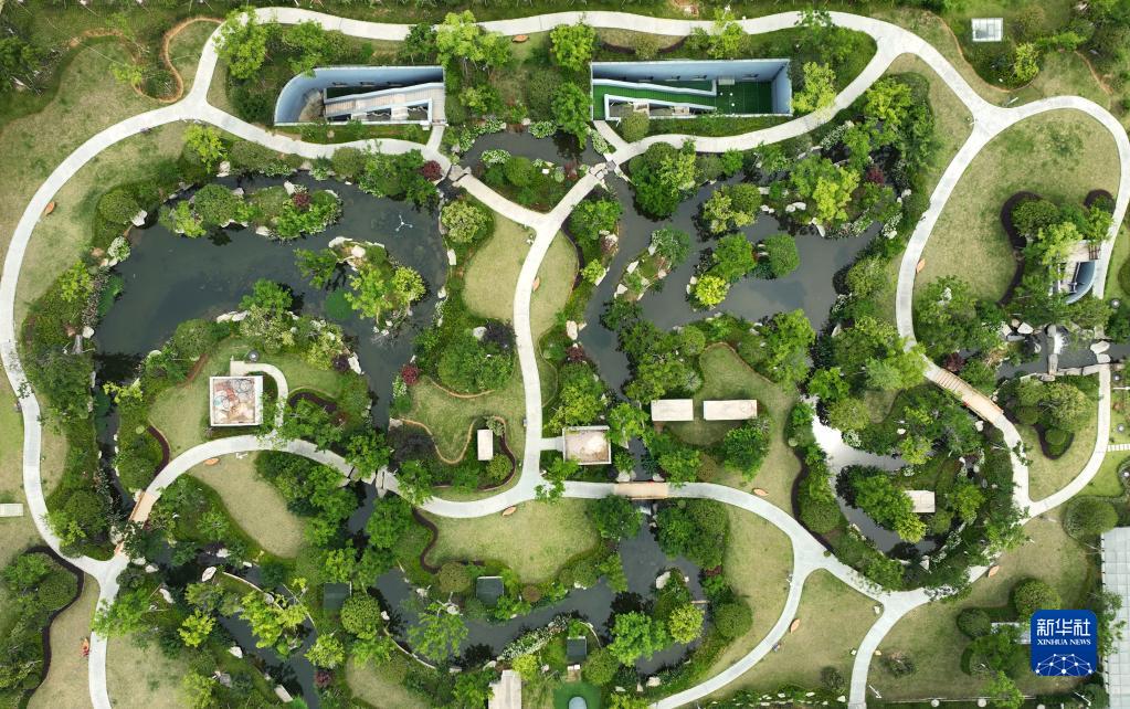 以“地上花園+地下治污”設計理念建設的九江市雙溪公園(6月15日攝,無(wú)人機照片)。