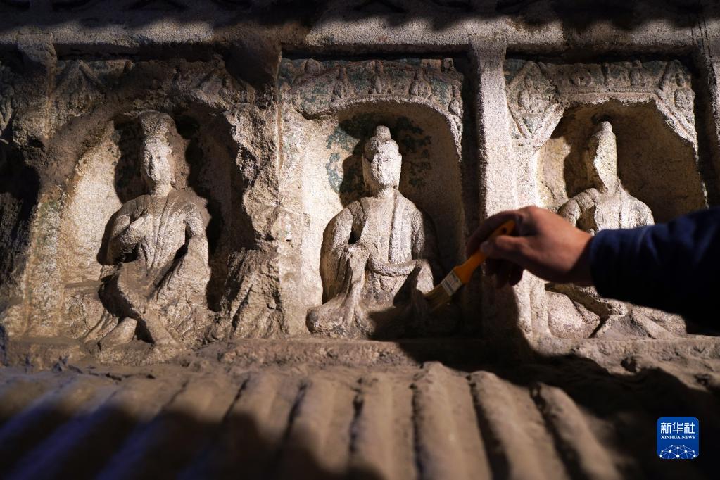 在山西大同云岡石窟,工作人員對石窟進(jìn)行維護保養(2021年5月7日攝)。