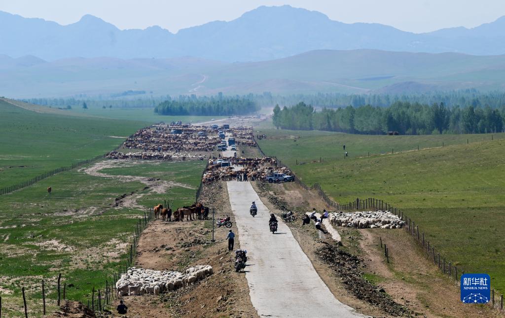 6月15日,牧民們趕著(zhù)牲畜行走在遷徙路上。