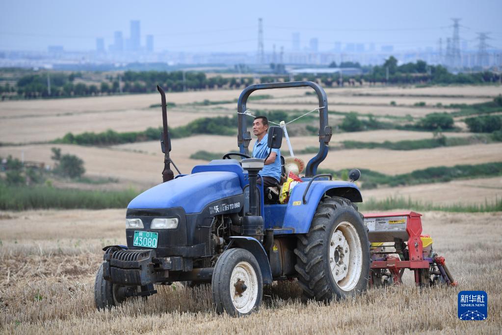 6月16日,長(cháng)豐農機專(zhuān)業(yè)合作社的農機手駕駛拖拉機,在西安市長(cháng)安區神禾塬萬(wàn)畝優(yōu)質(zhì)糧食生產(chǎn)基地播種玉米。