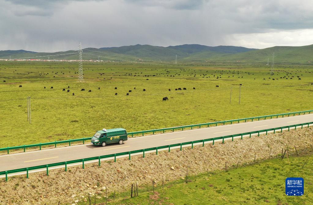 哈弄奪機開(kāi)著(zhù)郵車(chē)奔波在若爾蓋大草原的郵路上,為農牧民提供服務(wù)(6月14日攝,無(wú)人機照片)。