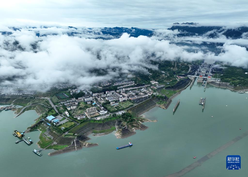 6月18日,船舶行駛在三峽大壩前的湖北省宜昌市夷陵區太平溪鎮水域(無(wú)人機照片)。