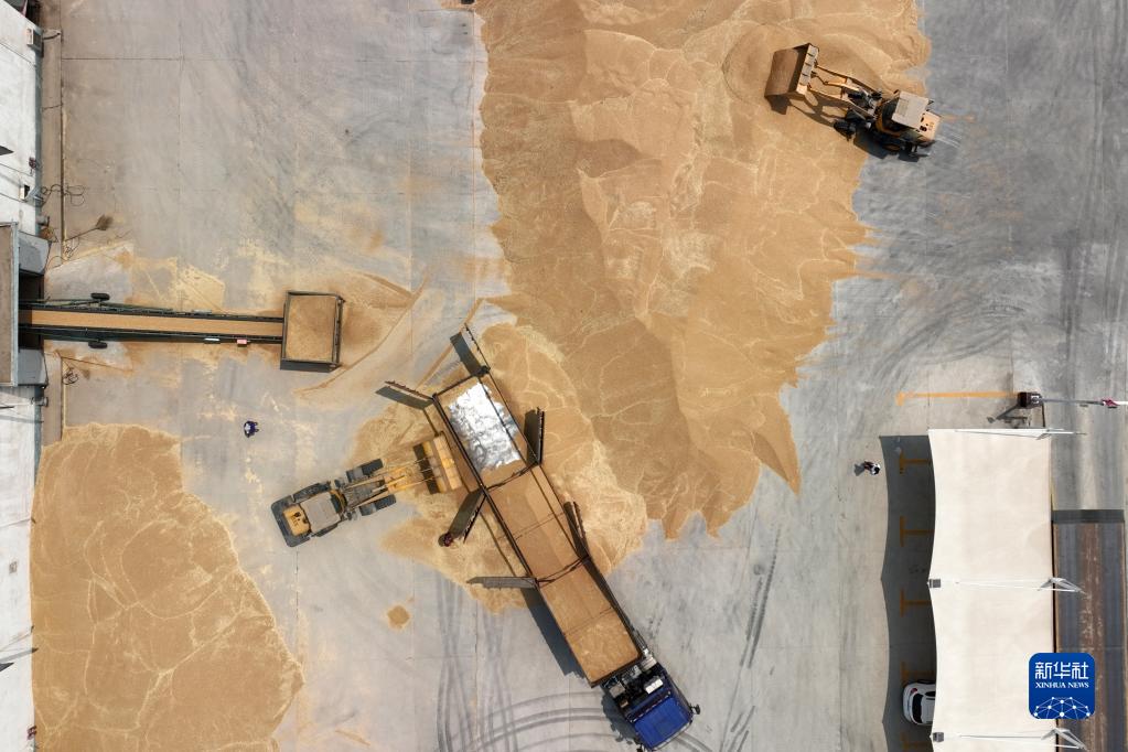 6月18日,在位于柏鄉縣的河北金谷源糧油集團股份有限公司,作業(yè)車(chē)輛正在將收購的小麥入庫(無(wú)人機照片)。