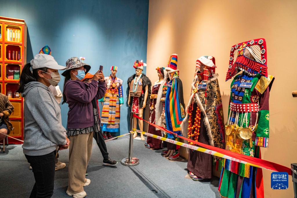 幾名游客在拍攝西藏各地特色服裝(6月17日攝)。