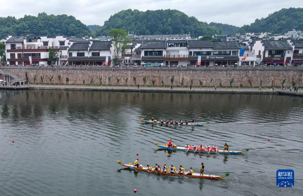 6月18日,龍舟隊在安徽省黃山市屯溪區新安江水域上展開(kāi)角逐(無(wú)人機照片)。
