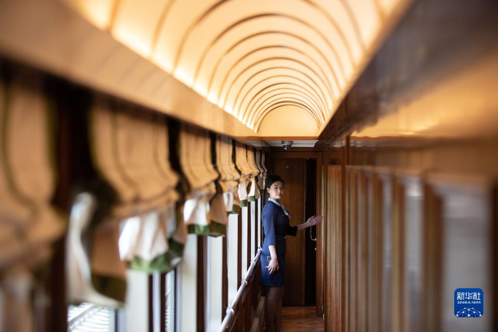 6月18日,乘務(wù)員在“林都號”旅游列車(chē)車(chē)廂工作。