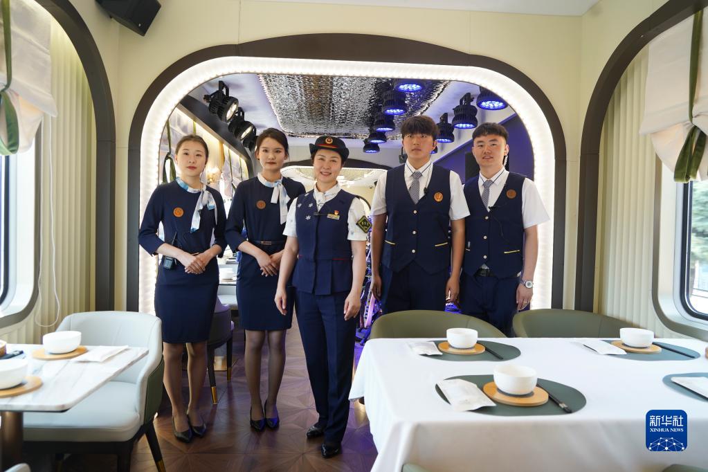 6月18日,乘務(wù)員在“林都號”旅游列車(chē)餐車(chē)車(chē)廂迎接乘客用餐。