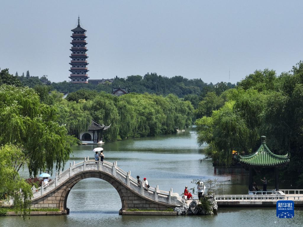 游人在揚州瘦西湖二十四橋游覽(6月15日攝,無(wú)人機照片)。