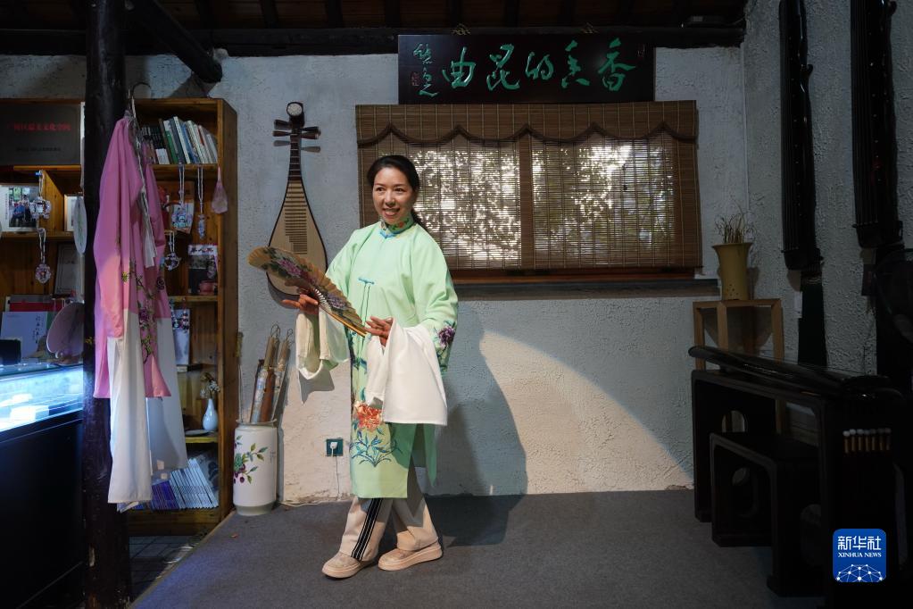 在揚州仁豐里,昆曲非遺傳承人張春香在表演(6月14日攝)。