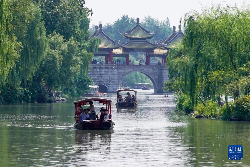 游客乘船在揚州瘦西湖風(fēng)景區內參觀(guān)游玩(6月15日攝)。